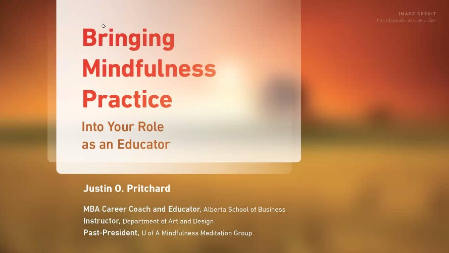 This session, led by Justin Pritchard (career coach and educator at the University of Alberta), explored the role of mindfulness in teaching and learning. More than a wellness buzzword, mindfulness was presented as a practical strategy to help educators manage anxiety, foster presence, and create healthier classroom environments.